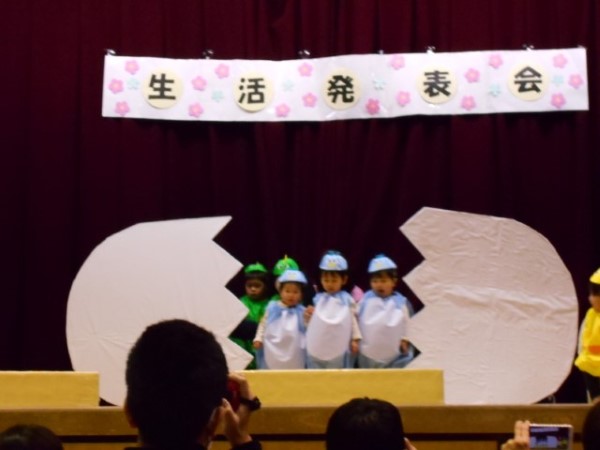 今回初めて楠地区会館の体育室での生活発表会でした。大きな舞台に子どもたちはドキドキと緊張をしていましたが、お遊戯、オペレッタ、劇、楽器演奏などの発表を、たくさんの保護者様の前で精一杯頑張りました。子どもたちの成長がとても感じられた生活発表会となりました。