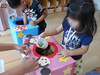 “小さな園の小さなお祭り”ということで、手作りいっぱいのゲームコーナーや人形劇、盆踊りを計画しました。当日はお父さんお母さん、お兄ちゃんお姉ちゃん、素敵な「夏の思い出」となりました。