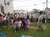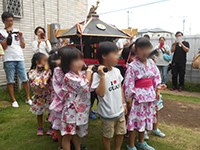 ご家族の方はじめおともだちや、近所の方も参加いただき、大賑わいでした。今年の目玉は、なんといっても年長さんが作ったおみこしです。近隣を幼児組みんなで「わっしょい、わっしょい」と練り歩きました。昨年までとは一味違った、活気あるお祭りを子ども達も職員も楽しみました。
