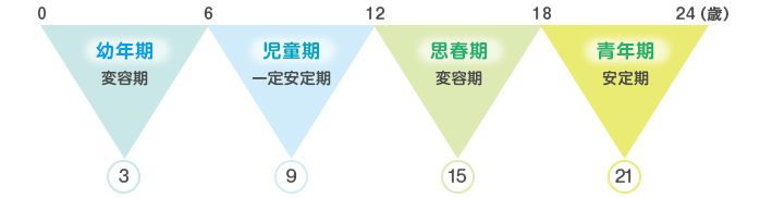 | 青年期:18~24歳 | 上記のように思春期を過ごすと地球人としての意識が芽生え、自分の好きな分野で社会に貢献することを考えられるように成長します。 |